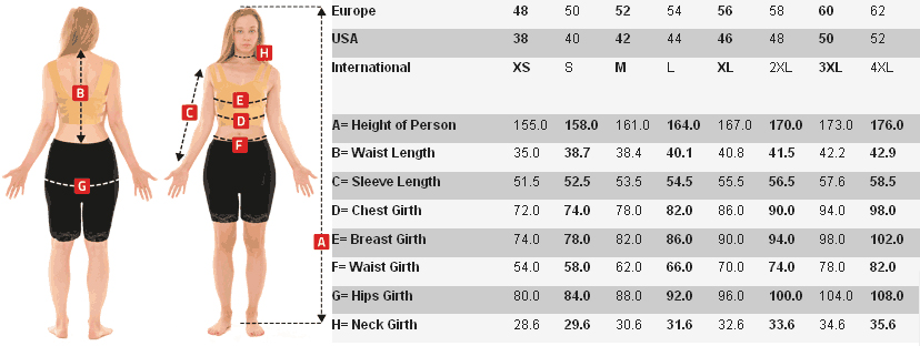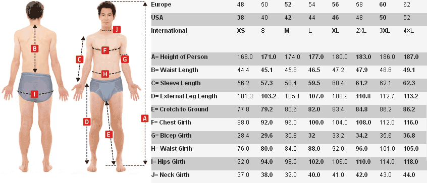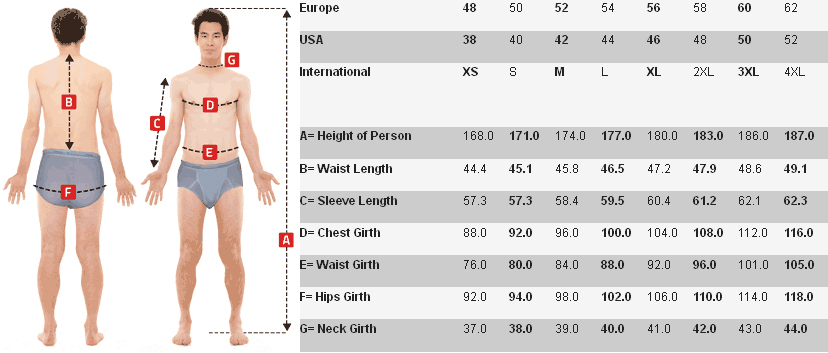 [F] Chest Girth: This measurement is taken at the fullest part of your chest (across your nipples) under the arms, closely around the body. |
